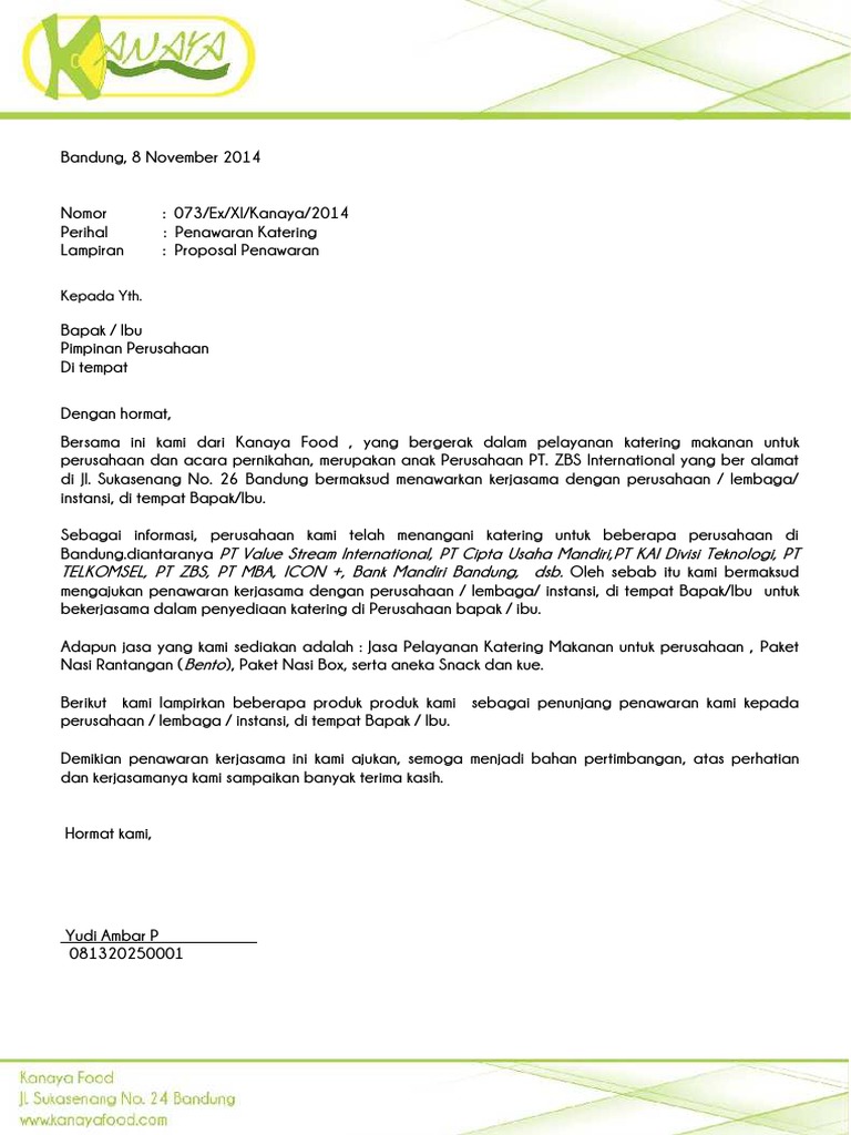 15 contoh surat penawaran produk yang benar dan paling lengkap dalam menjalankan sebuah perusahaan maka setiap orang tentu akan menggunakan surat resmi. Bagaimana cara membuat surat penawaran catering? Contoh surat penawaran jasa katering. Contoh proposal penawaran catering ke perusahaan. Jan 30, 2016 · zakky catering proposal penawaran catering hotel, kantor & pabrik jl.